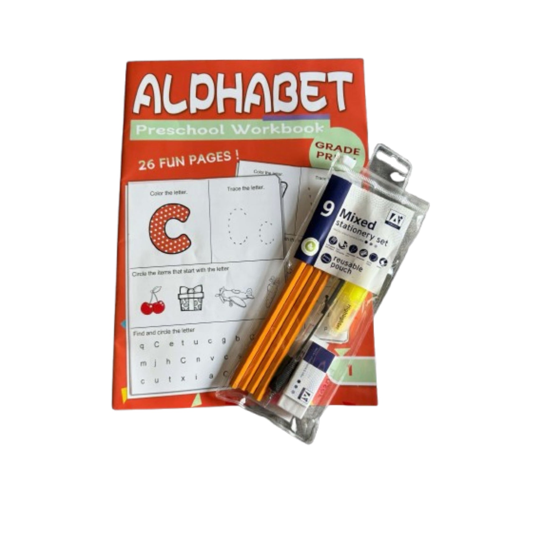 The Alphabet Preschool Workbook / 9pc Stationery Set is a complete early-learning package designed to support children in developing essential alphabet recognition, writing, and fine motor skills.