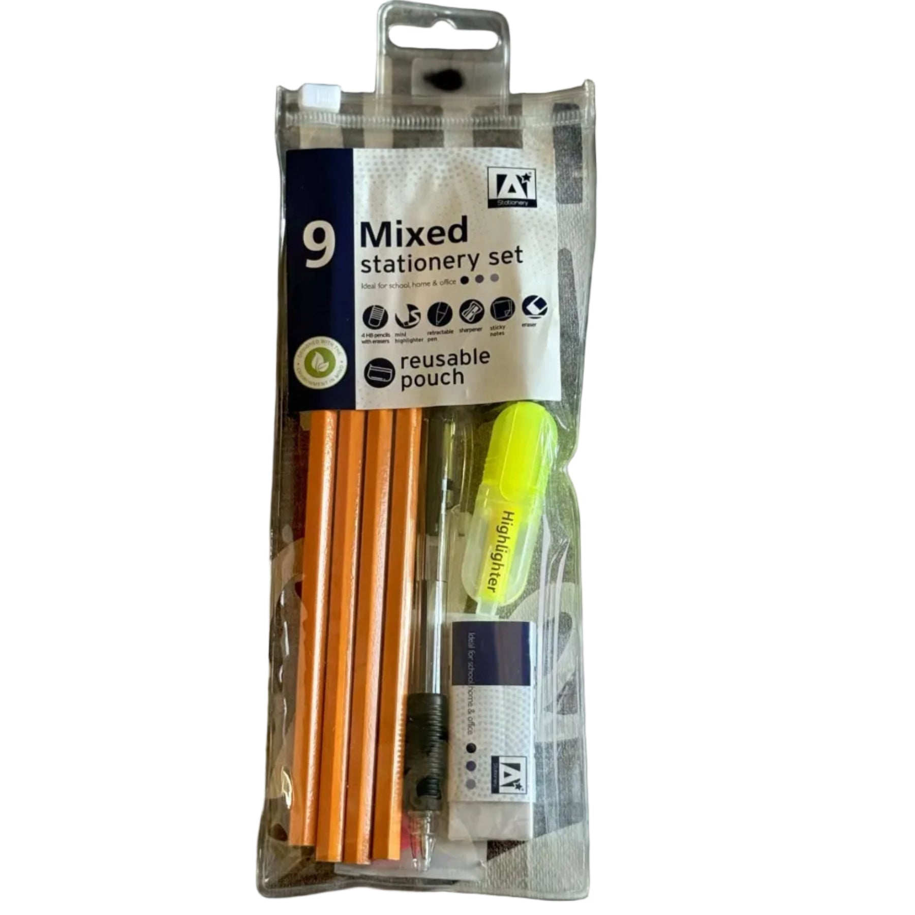 9pc Stationary Set - 4x Pencils, 1x Pen, 1x Pencil Sharpener, 1x Eraser, 1x Highlighter, 1x Stick Notes
