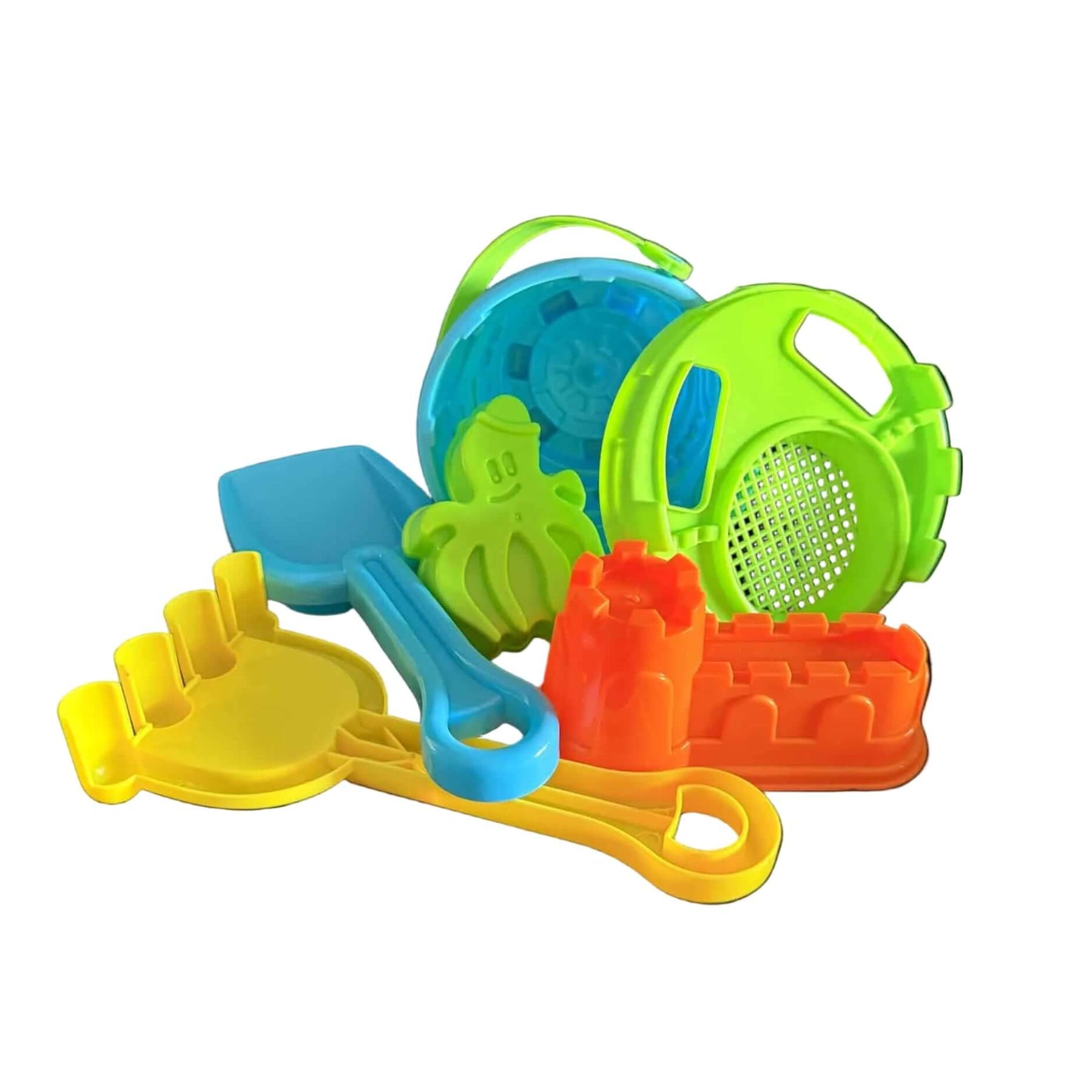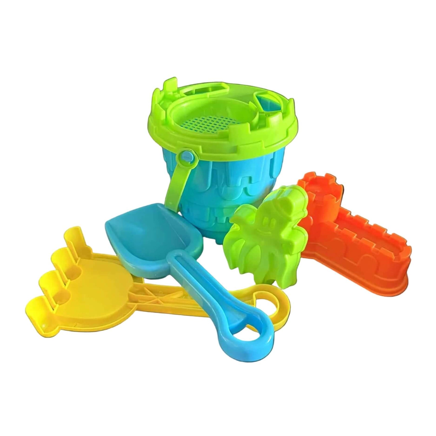 Set Includes: 6pc, 1x Bucket, 1x Bucket Sieve Lid, 1x Rake, 1x Spade, 2x Sand Moulds