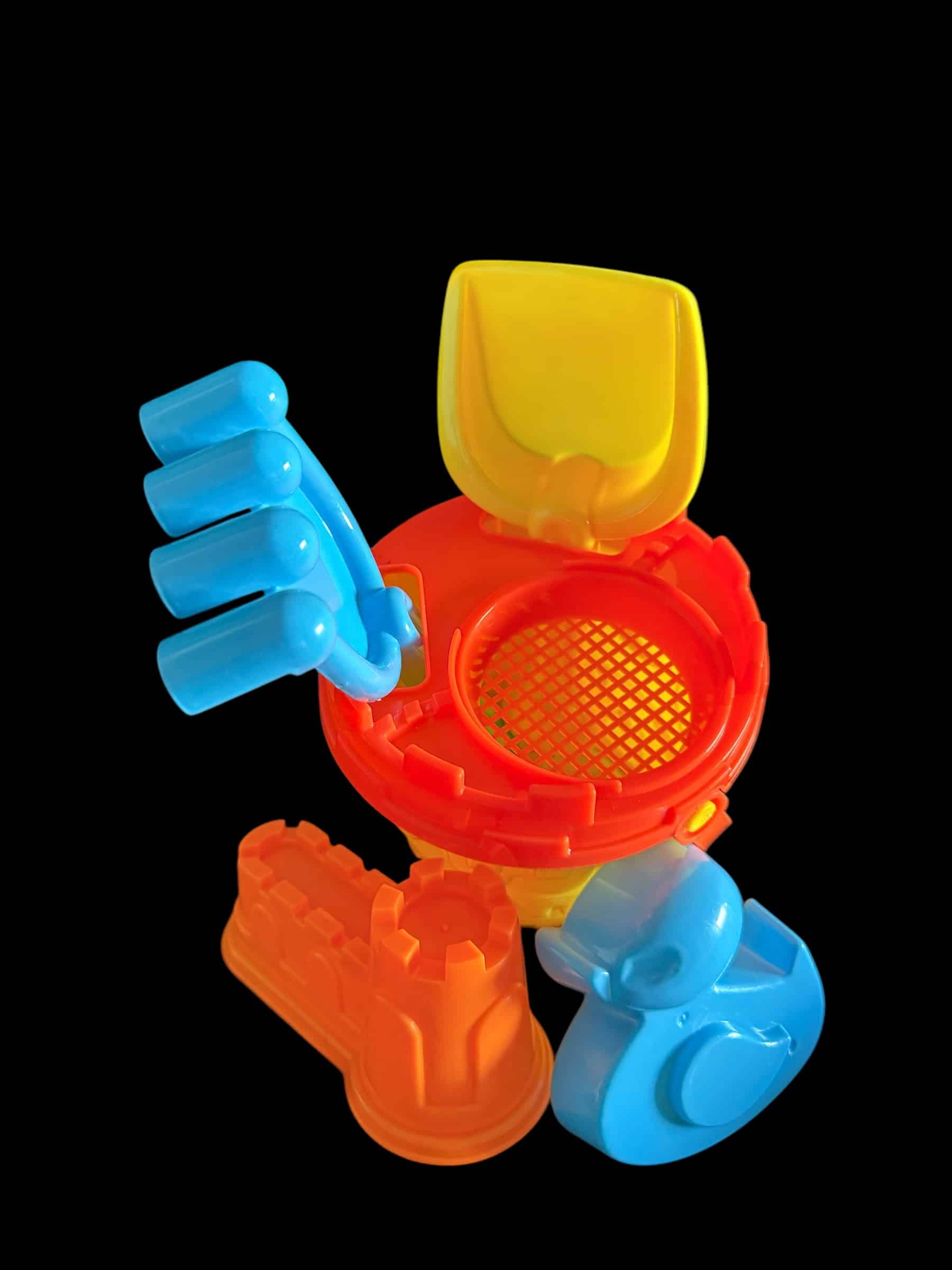 Set Includes: 6pc, 1x Bucket, 1x Bucket Sieve Lid, 1x Rake, 1x Spade, 2x Sand Moulds